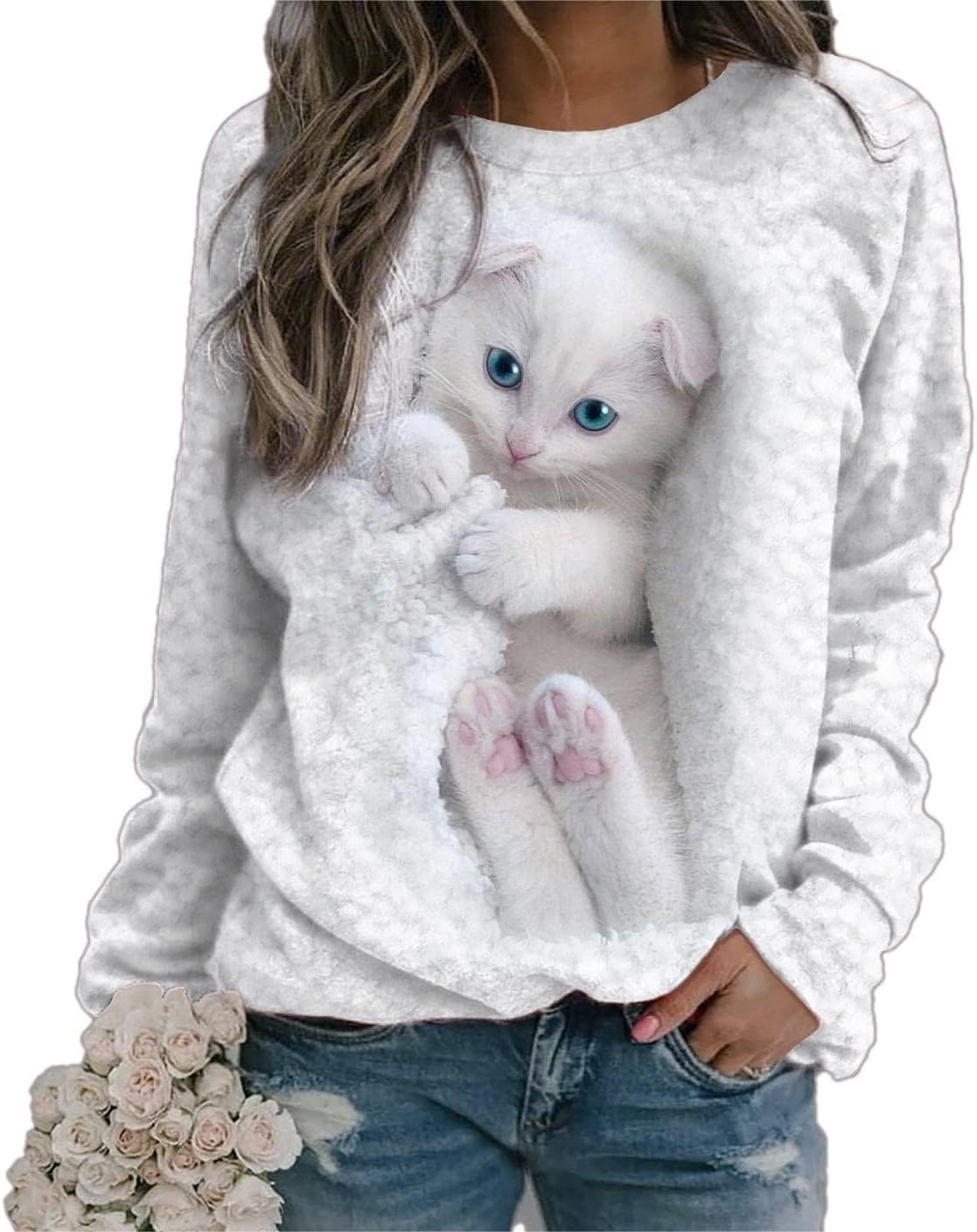 ShallWe Cat Fashion Shirt for Women Long Sleeve Lightweight Cute Casual Trendy Tops Active Shirts Spring Summer 2024 White, Small