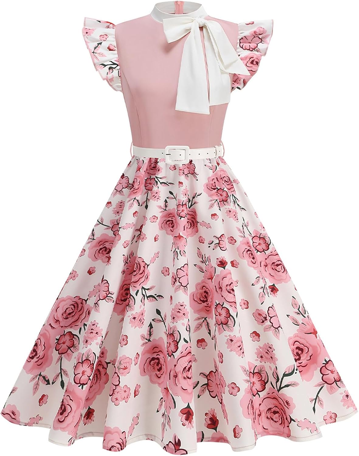 Bow Tie Neck 1950s Polka Dot Dresses for Women Vintage Floral 50s Audrey Hepburn Rockabilly Cocktail Swing Dress with Belt