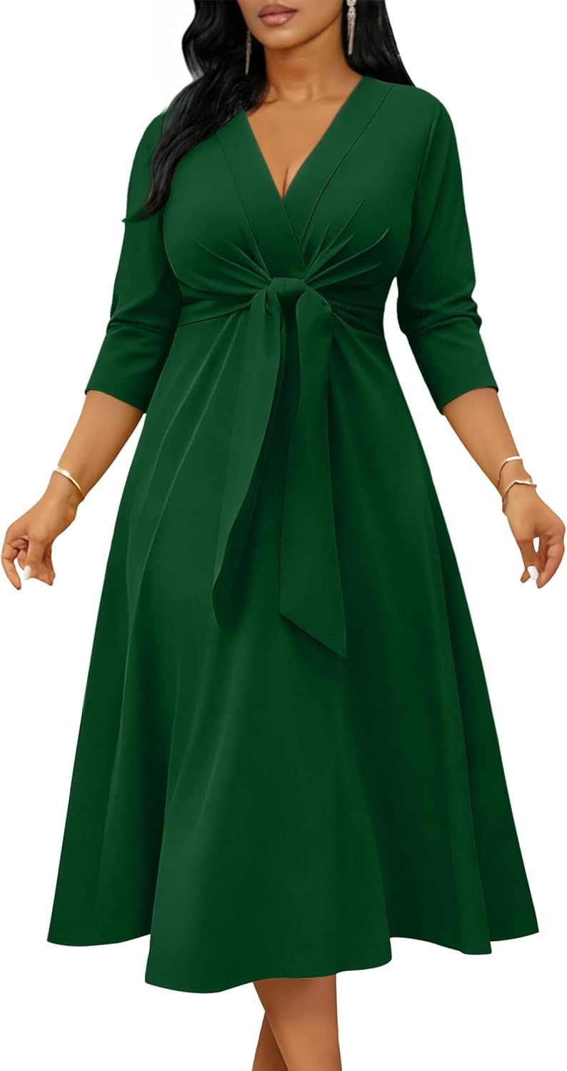 Nmoder Midi Dress for Women, V Neck Tie Front Fit and Flare Cocktail Dresses for Wedding Guest A-Line Dress with Pockets