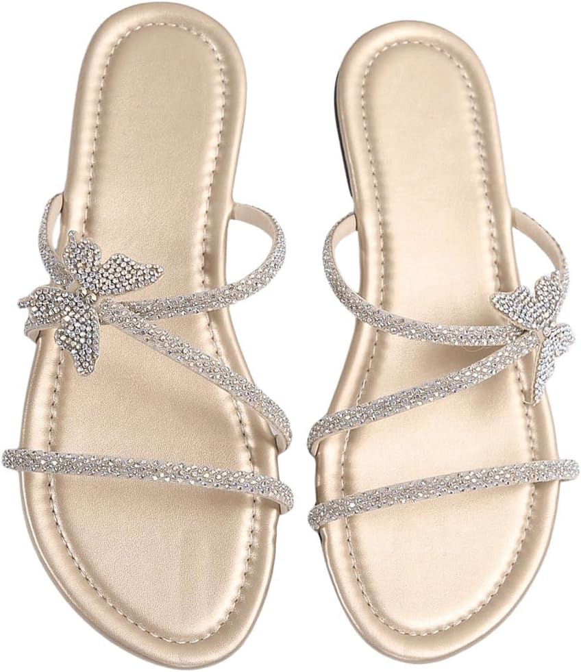 OYOANGLE Women's Butterfly Rhinestone Shiny Slide Sandals Strappy Slip on Flat Sandals Dressy Casual Sliders
