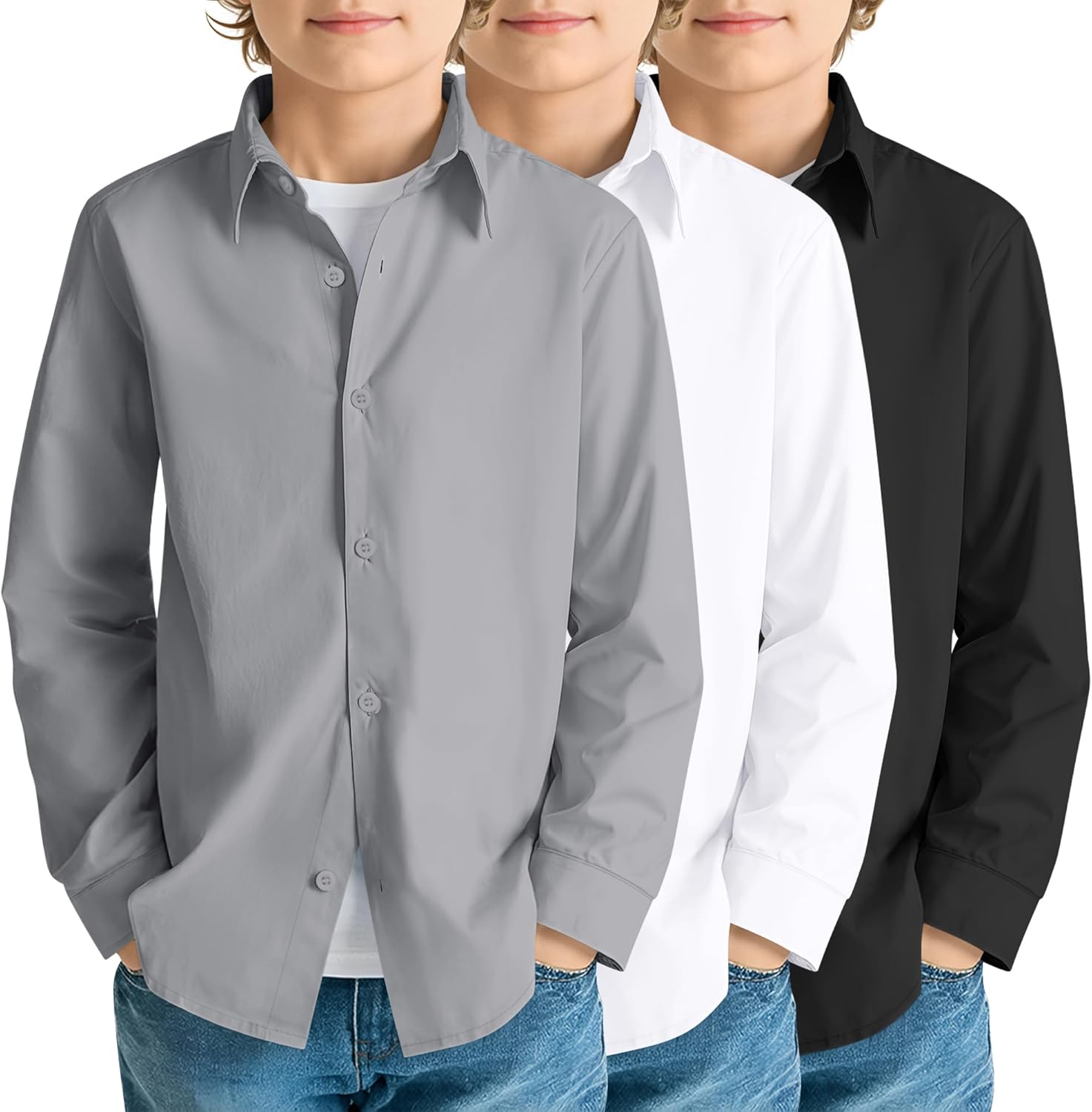 3 Pack Boy's Long Sleeve Dress Shirts Kids Casual Button Down Shirt Boys Solid Button Up School Uniform Tops