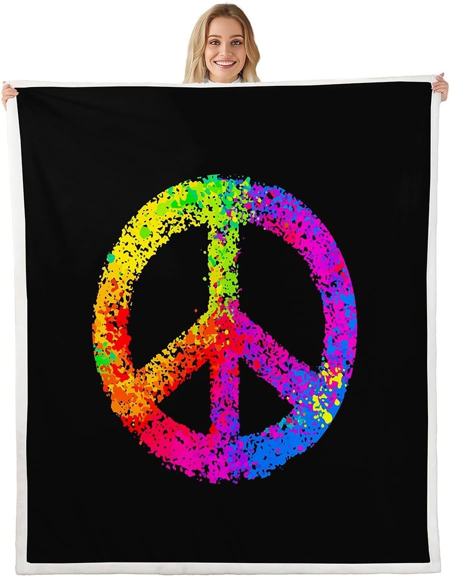 Feelyou Hippie Peace Art Sherpa Blanket Peace Sign Artwork for Couch Travel Sofa Colorful Tie Dye Fleece Rainbow Fuzzy Room Decor Plush 50"x60"