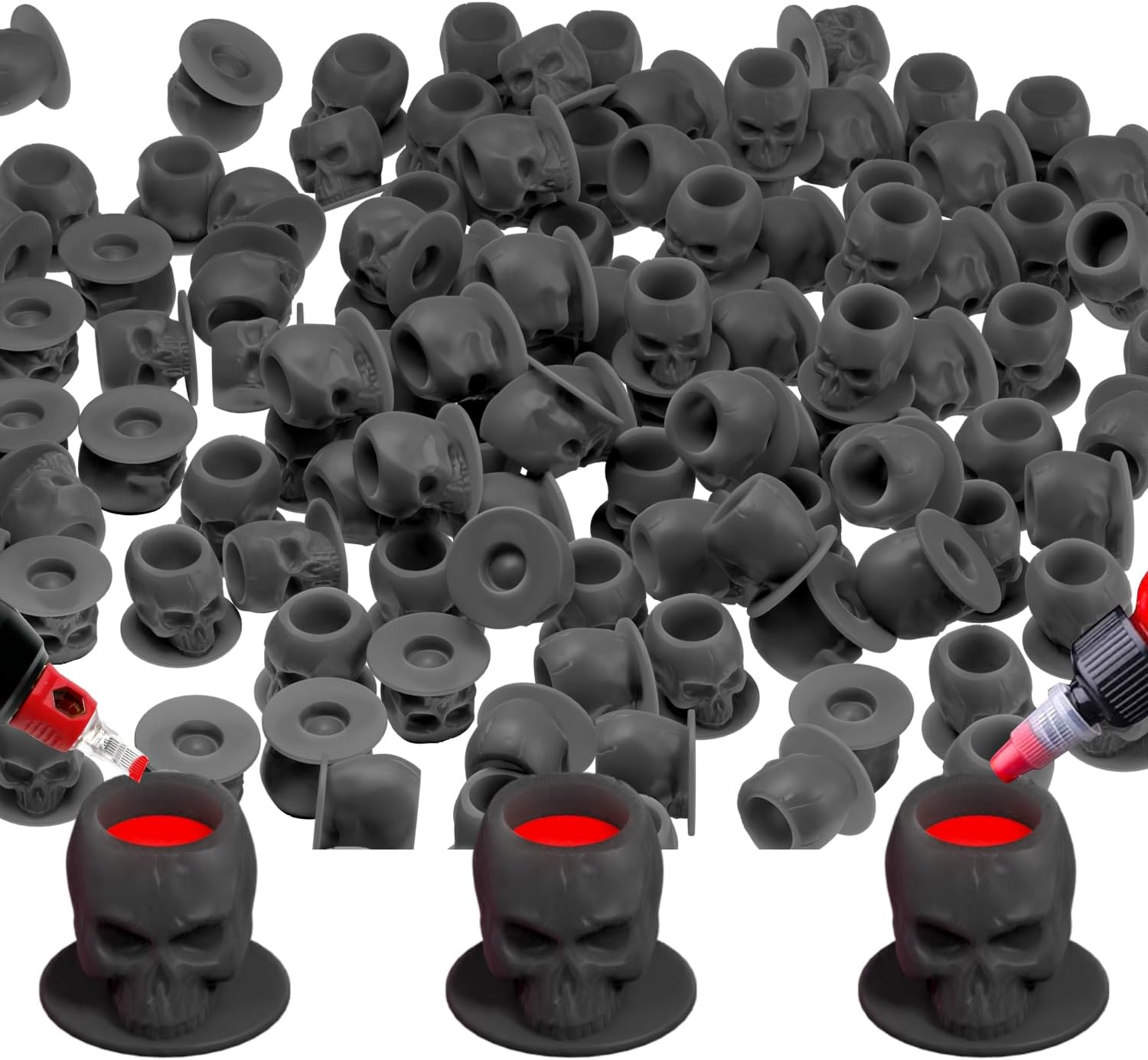 - Unique design - Skull shaped tattoo ink caps made of silicone material,Tattoo ink caps are unique and stylish containers designed for holding tattoo ink during the tattooing process.