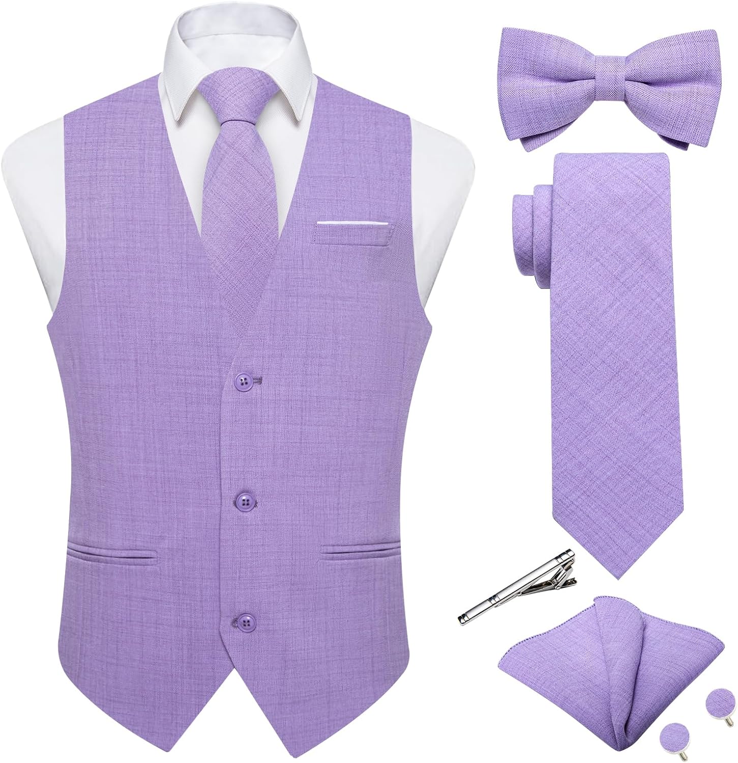 DiBanGu Mens Linen Suit Vest Casual Waistcoat and Necktie & Pre-tied Bowtie Set 6PCS Solid Color Dress Vest for Wedding Party