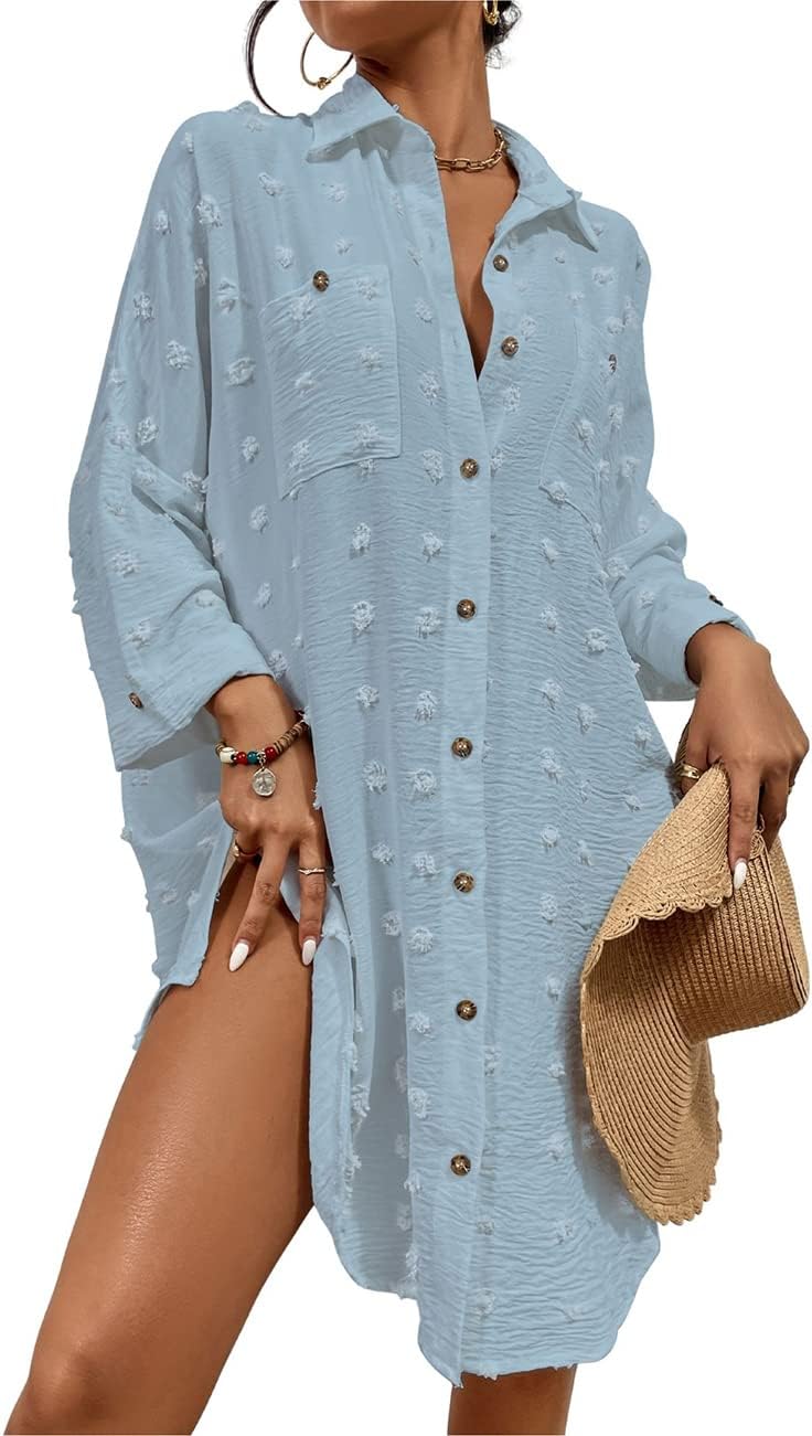 Bsubseach Women Swimsuit Coverup Blouse Button Down Shirt Dresses Swiss Dot Tops