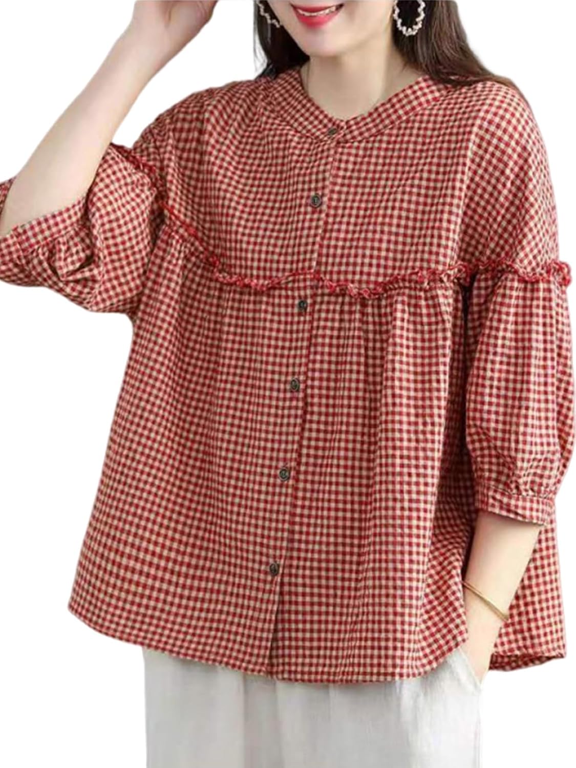 utcoco Womens Plaid Button Down Shirts Casual Loose Fit 3/4 Sleeve Tunic Tops Checkered Blouses