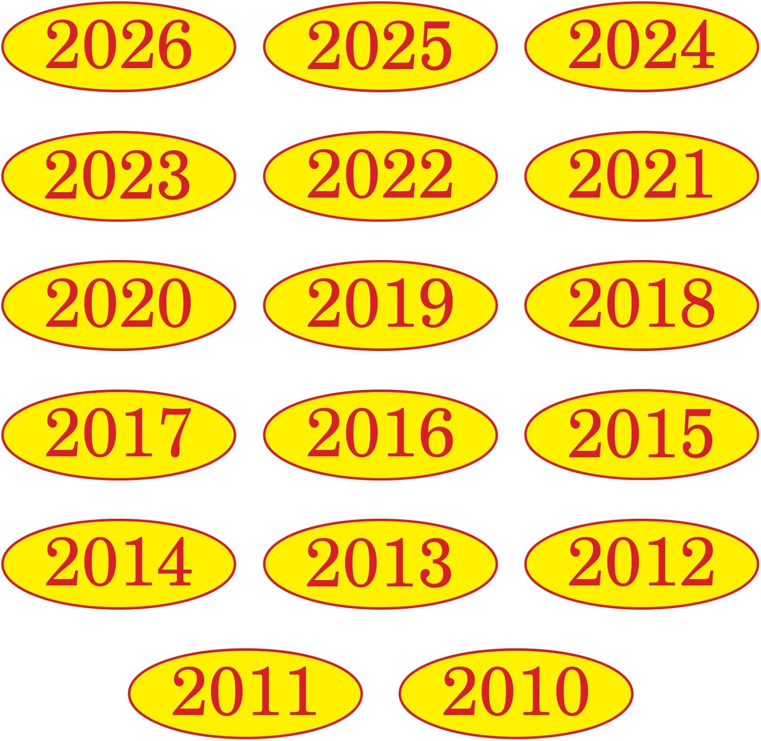 Car Windshield Year Stickers (2010-2026) - 17 Pack(1 per Year), Red & Yellow Large Oval Vinyl - Waterproof, Easy to Remove, Residue-Free - Ideal for Used Car Dealers & Auto Dealerships
