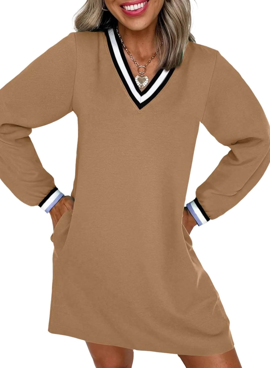 EVALESS Womens Dresses 2026 Spring Fall V Neck Long Sleeve Casual Tshirt Dress Contrast Striped Sweatshirt Dress
