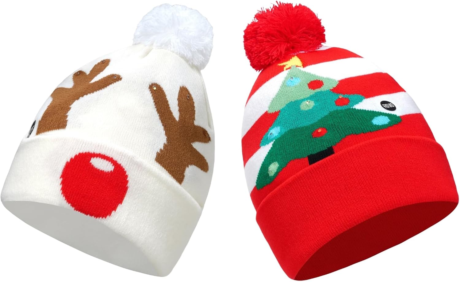 Christmas Hat 2 Pack Light Up Knitted Beanie Hat Xmas Santa Holiday Cap LED Lights