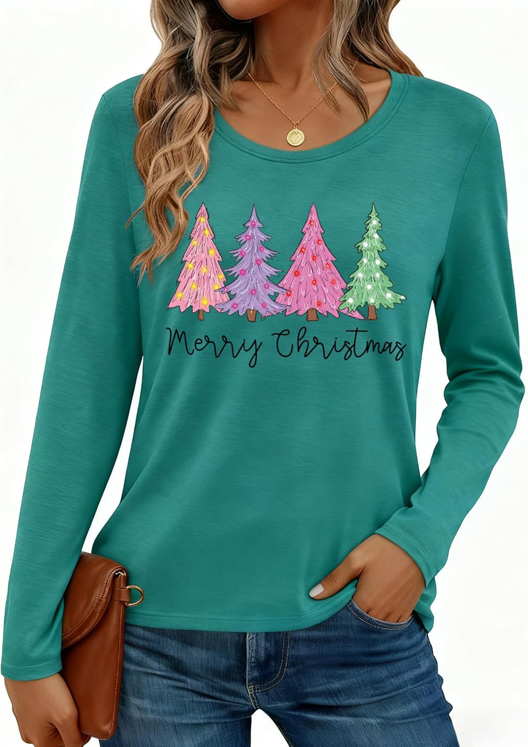 Merry Christmas Shirts for Women: Christmas Tree Long Sleeve Xmas Blouse Tops
