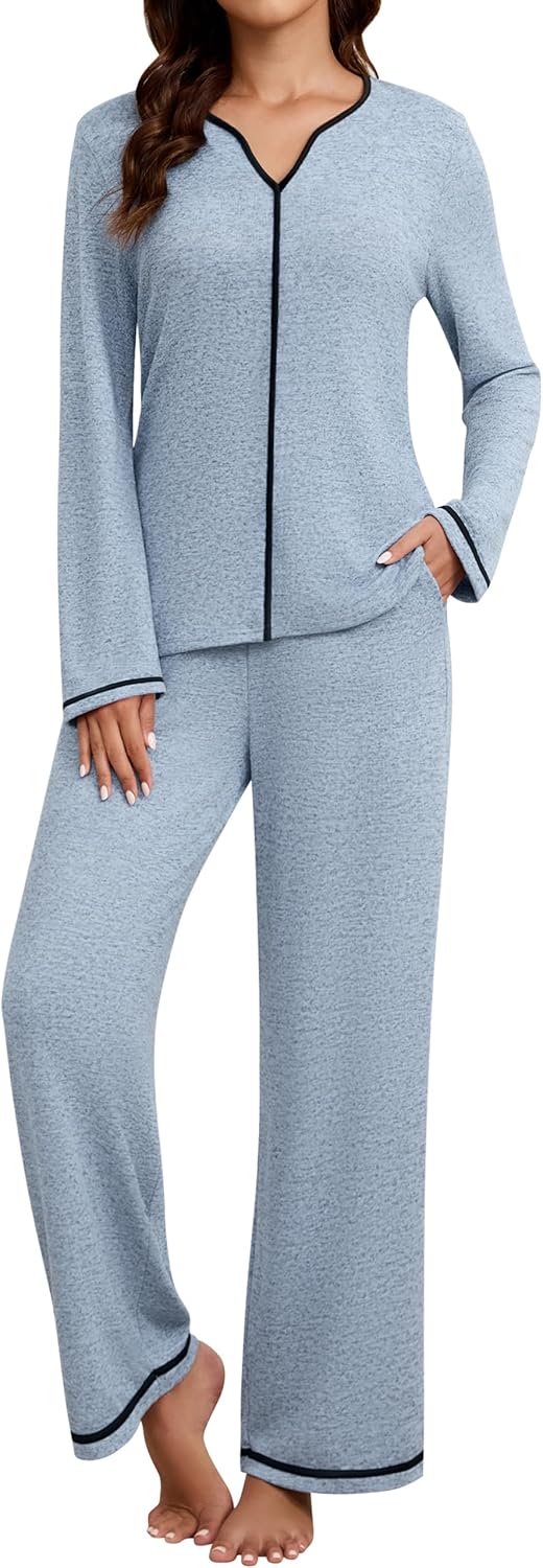 Blooming Jelly Womens 2 Piece Color Block Pajama Set Soft Fall V Neck Lounge Sets Wide Leg Pants Sleepwear Pockets