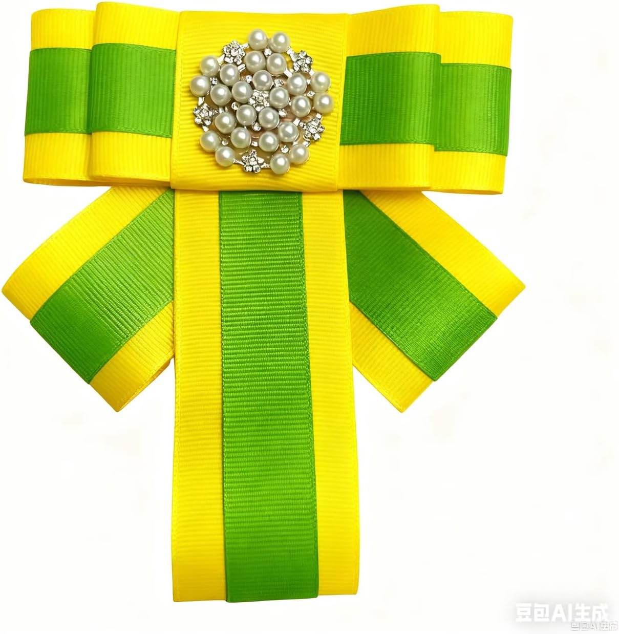Ribbon Bow Tie Pearl Brooch Bow Pin, Green and Yellow Grosgrain Ribbon with Crystal Accent, Decorative Fashion Accessory, Sorority Paraphernalia Brooch Pin for Women Greek, Inspired for Chi Eta Phi, Conferences, Luncheons