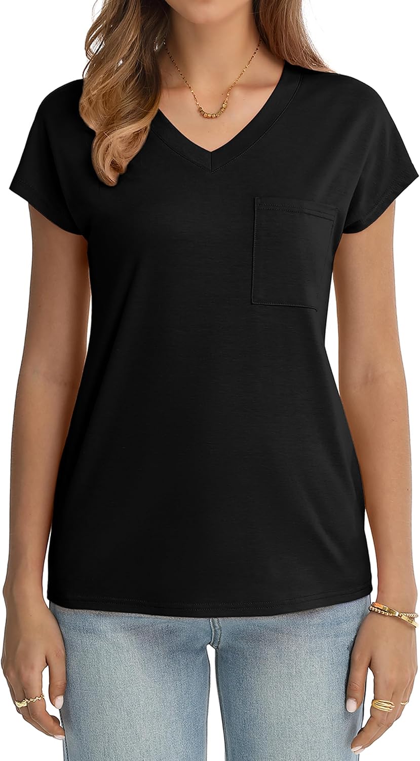 QUALFORT Womens V Neck T Shirt Short Sleeve Casual Top with Pocket Cap Sleeve Regular Fit Trendy 2026