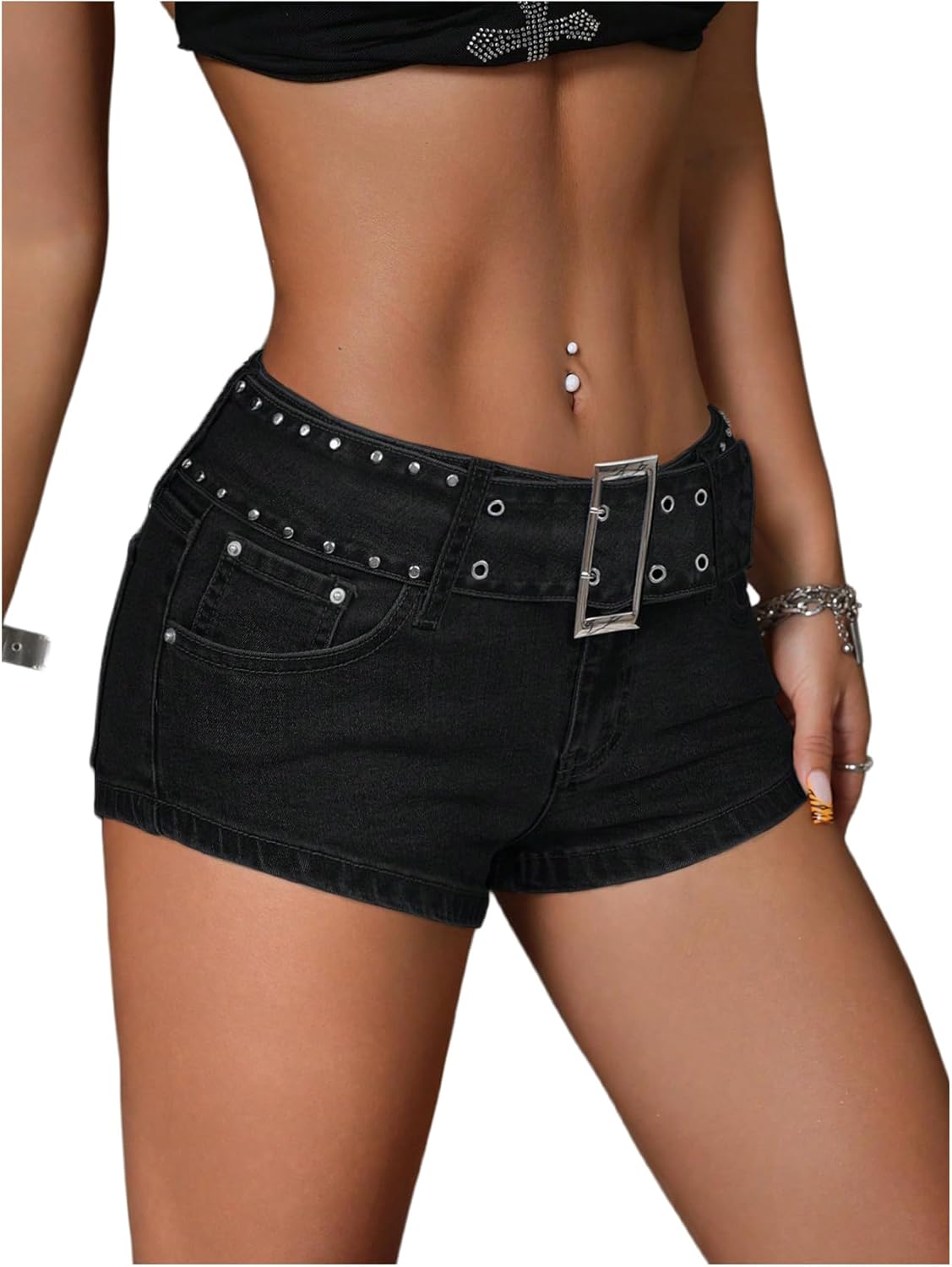 WDIRARA Women's Low Rise Grommet Eyelet Belted Denim Shorts Y2k Mini Jean Shorts