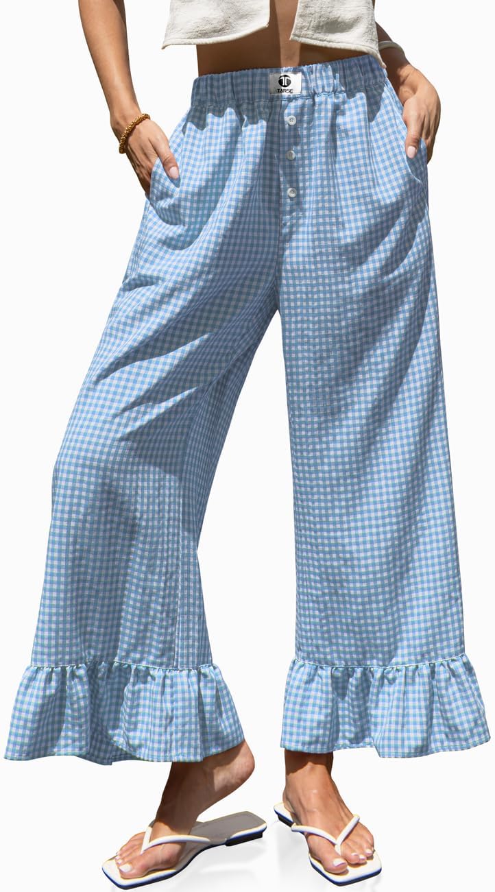 TARSE Women’s Plaid Wide Leg Pants Flared Leg Baggy Drawstring Ruffle Palazzo Pants with Pockets