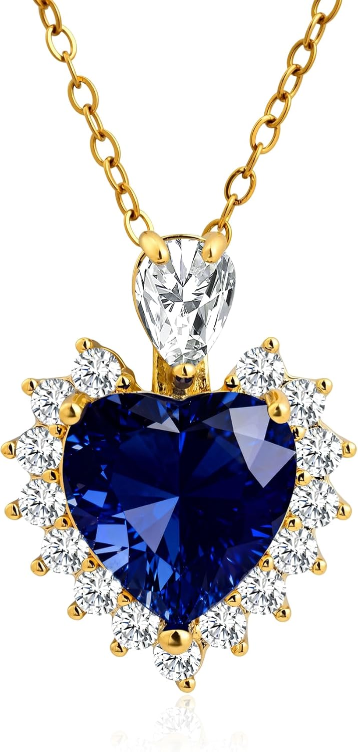 14k Gold Plated Sapphire Blue Heart of The Ocean Pendant Adjustable Chain Cubic Zirconia Birthstone Thin Necklace for Women Jewelry
