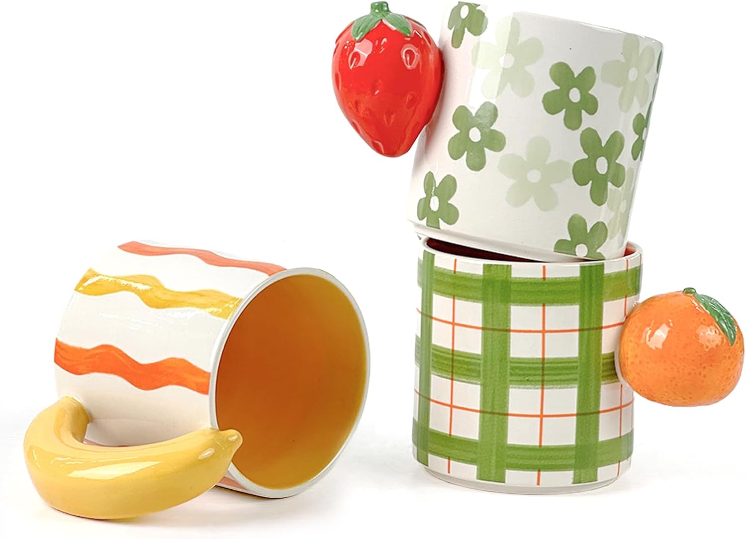 Ceramic Coffee Mugs Set of 3, Stackable Funny Tea Cup with Unique Fruit Shape Aesthetic Mug with Handle for Latte/Cappuccino/Cocoa - Microwave and Dishwasher Safe (14oz)