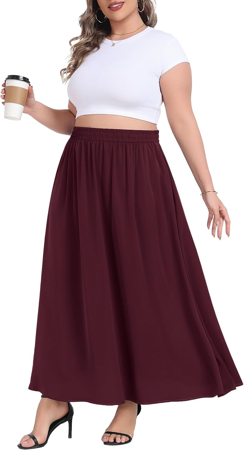 Lastshe Plus Size Maxi Skirt for Women Casual Elastic High Waist Boho Flowy A-line Spring Long Skirts with Pockets