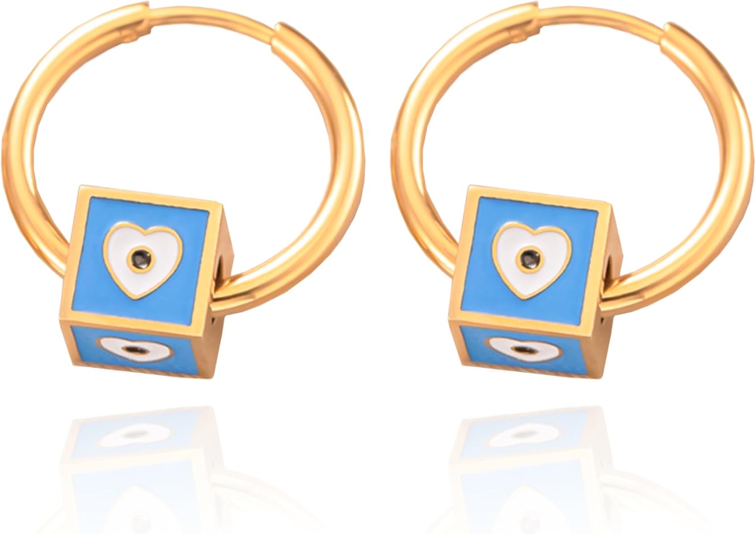 Gold Hoop Earrings For Women, with Cube Charms, Heart and Eye Design - Gold Plated Heart Hoop Earrings