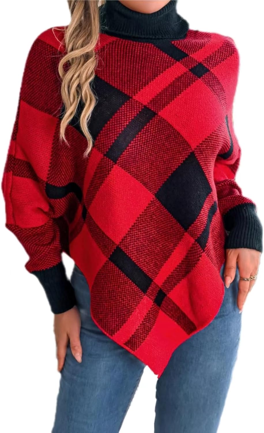 Women Turtleneck Poncho Sweaters Long Sleeve Cape Sweater Fall Winter Christmas Color Block Plaid Knit Pullover