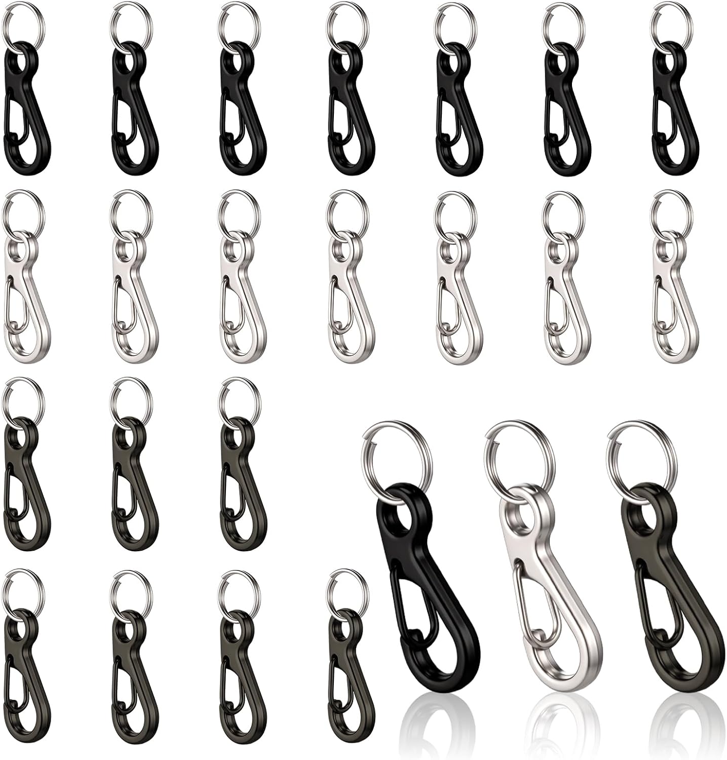 - Stylish Color Options: Available in three sleek colors: black, grey, and silver. The set includes 24 mini carabiner clips and 24 10mm double loops, ensuring you have everything you need for your accessory & keychain carabiners