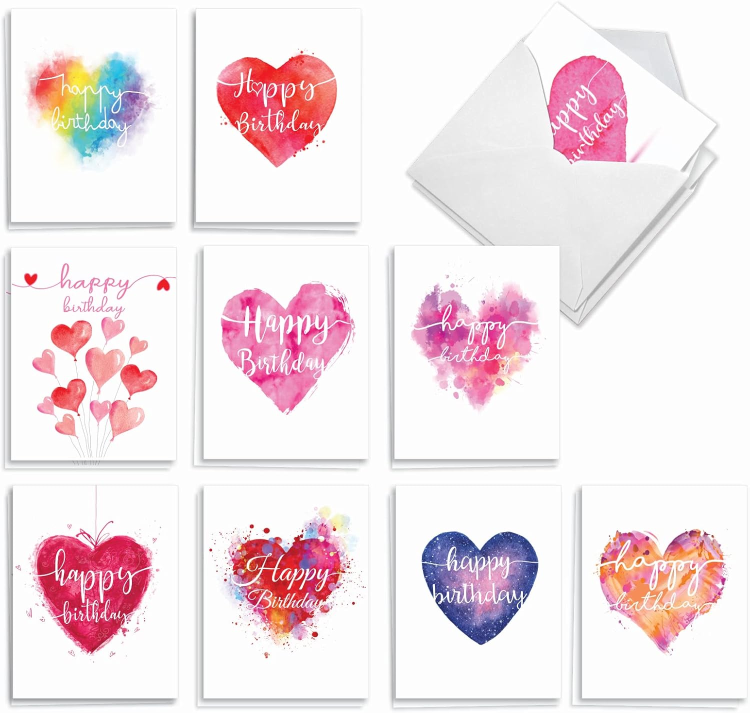 The Best Card Company 20 Assorted Birthday Notecards Bulk Box Set 4 x 5.12 Inch with Envelopes (10 Designs, 2 Each) Line Heart AM3182BDG-B2x10