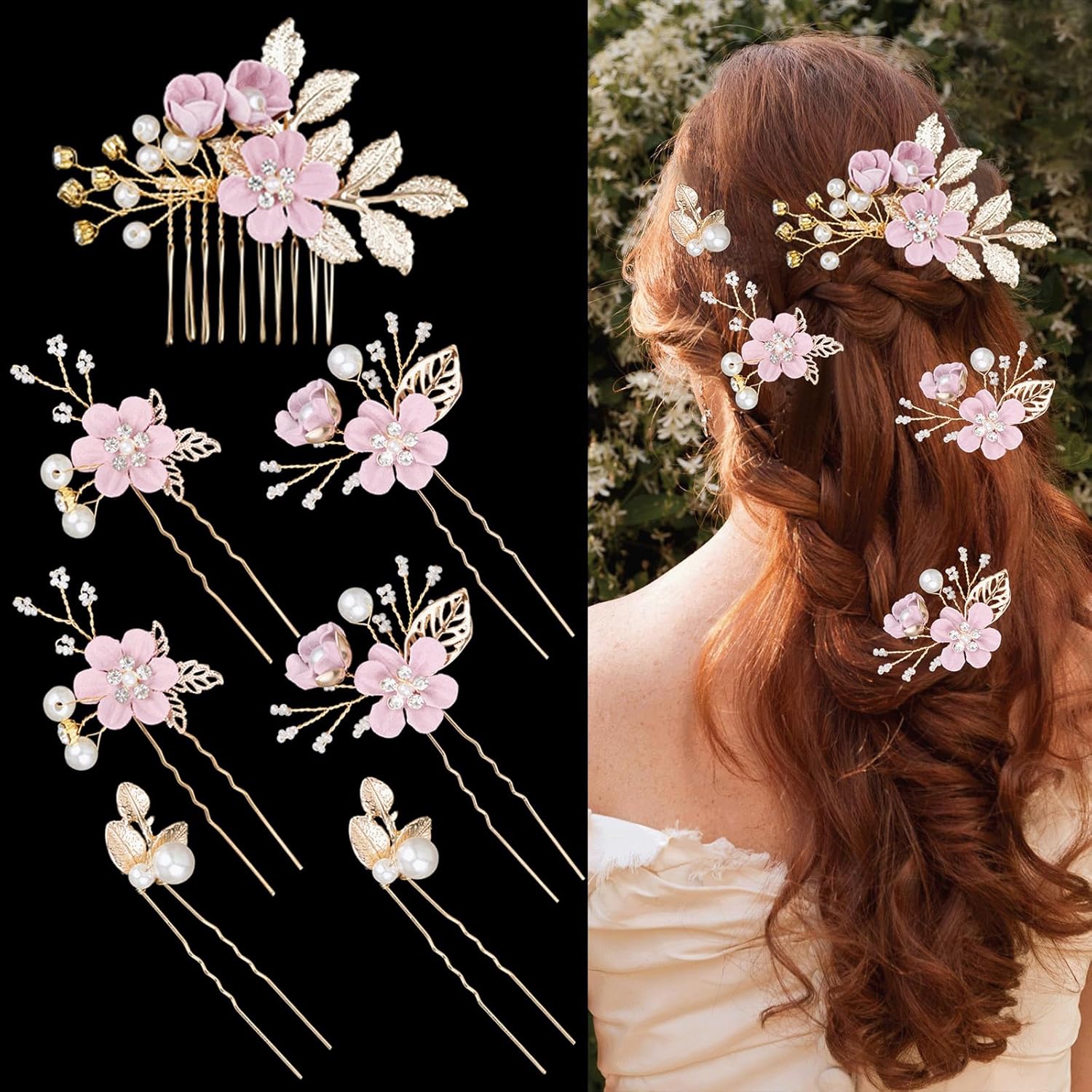 7 PCS Bridal Flower Wedding Hair Clips Crystal Pearl Hair Pins Headpiece Side Bridal Comb Gold Wedding Hair Accessories Jewelry for Brides Bridesmaids Women Girls Updo(Purple)