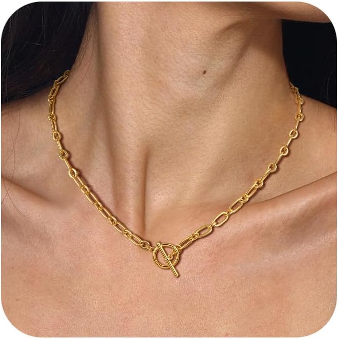 14K Gold Necklace for Women, 14K Gold Plated Chain Necklace Dainty Choker Necklace for Women Trendy Chunky Pendant Necklaces Layering Toggle T-bar Clasp Link Chain Necklace Jewelry