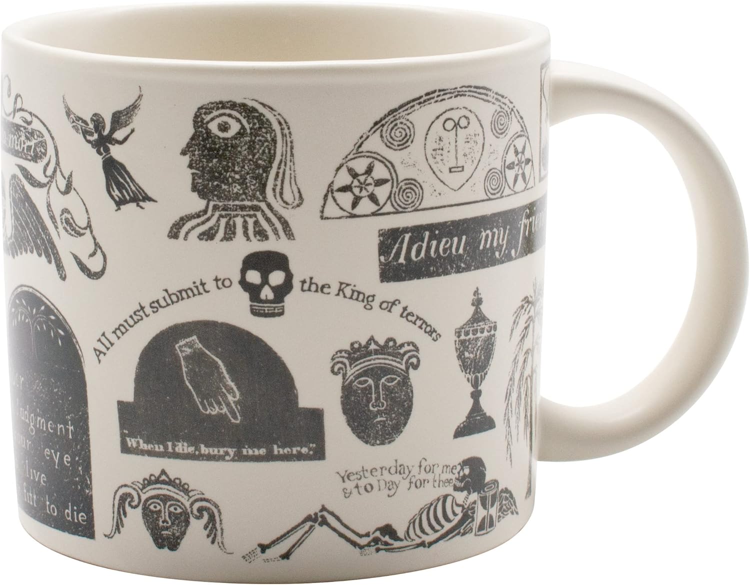 - This elegant and gothic mug is decorated with images and engravings from early gravestones and funerary monuments, including a skeleton and ouroboros inside the bottom of the mug.