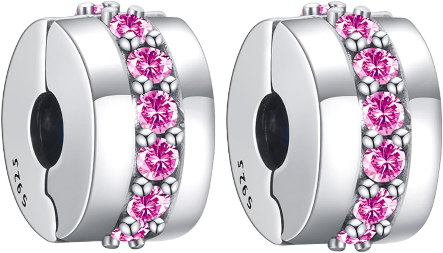 925 Sterling Silver Charms Clips Set Pink 5a Zircon Bracelet Bead Clip 2 Per Pack