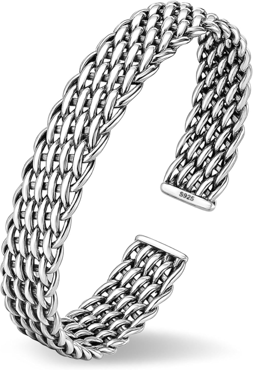 Handmade 925 Sterling Silver Bangle Bracelet for Men, Vintage Weighted Woven Bangle, Solid Silver Jewelry Gift, Adjustable Open Silver Plated Bracelet for Husband Father