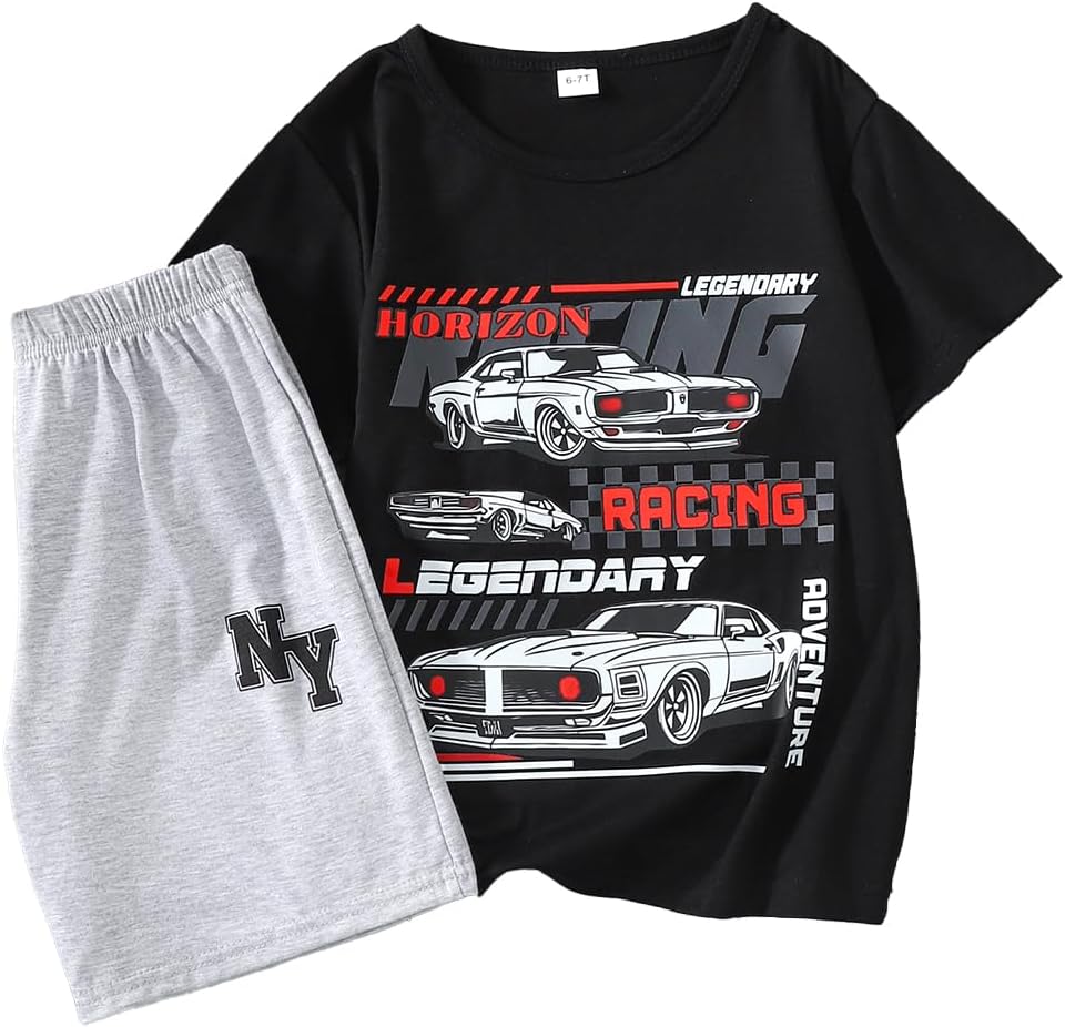 Boys Clothes 2-Piece Summer Outfit Car Print T-Shirt & Letter Print Shorts for Kids Clothing Set 6-12Y