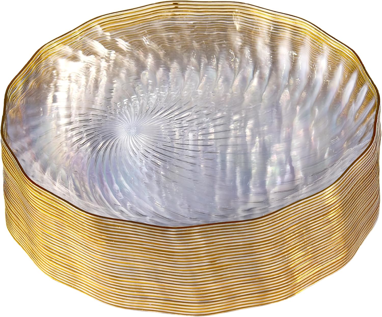 - 30 Pack 9 inch crystal clear plastic plates with gold rim feature a beautiful swirl design. Perfect for plating dinners, entrees or serving at your parties and dinners or for everyday use.