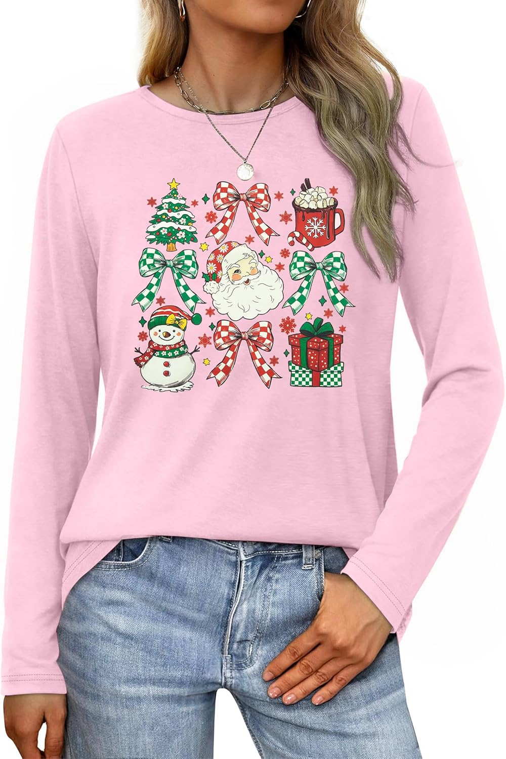 Merry Christmas Shirts for Women Santa Christmas Long Sleeve Shirt Xmas Holiday Party Blouse Tops