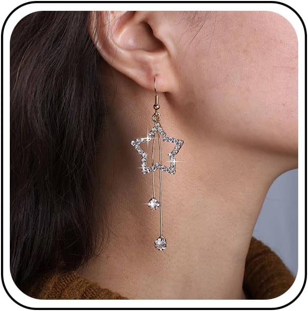 Bohemian Crystal Star Dangle Earrings Hollow Star Drop Earrings Gold Cz Star Hook Earrings Small Rhinestone Chain Earrings Jewelry for Women