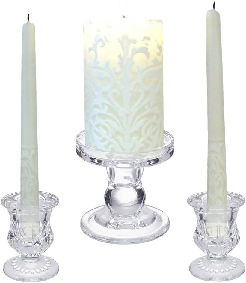 Glass Taper Candle Holders Set of 3, Clear Candlestick Holders for Pillar Taper Candles Elegant Carved Design for Church Romantic Dinners Holiday Decor Wedding Party