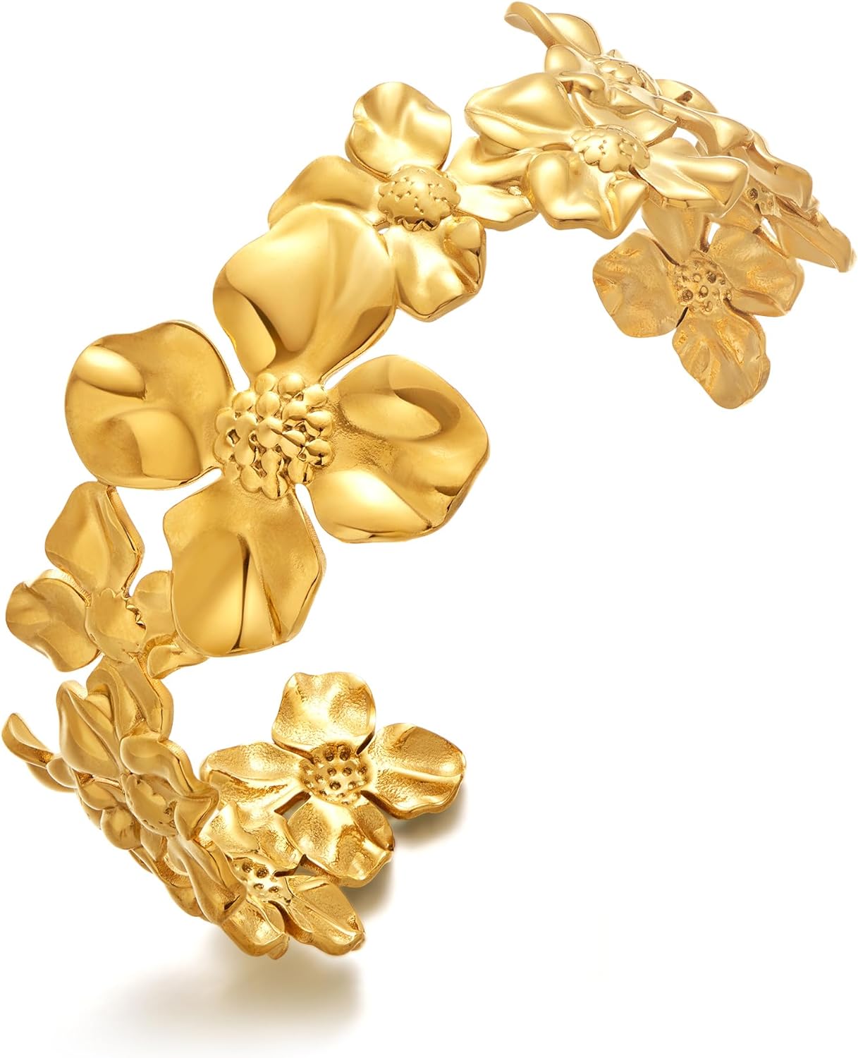 WOWORAMA Gold Flower Bracelets for Women Irregular Flower Cuff Bracelet Boho Vintage Gold Statement Bracelet Chunky Hammered Floral Bangle Bracelets