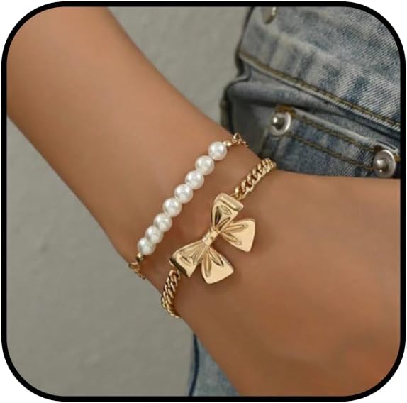 Pearl Bow Bracelet for Women Gold Stack Pearl Beaded Bracelet Chunky Bow Knot Chain Bracelet Adjustable Small Ball Charm Bracelet Trendy Jewelry Accessories