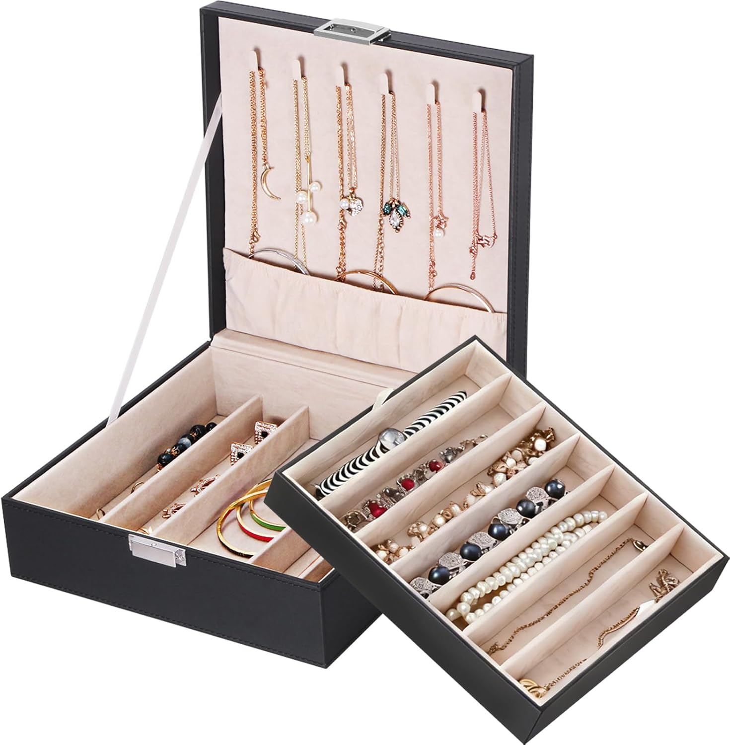 - CONSIDERATE DETAILS: Anti-rust metal snap buckle is easy to open and close with just one hand. Top tray has durable ribbons for easy lift-out; 6 functional hooks for necklaces and pendants on the lid, you can tuck the chain into bottom pocket to prevent tangling; bottom pocket could also organize more bigger jewelry items, such as bracelets watches. This thoughtful jewelry box will be very functional