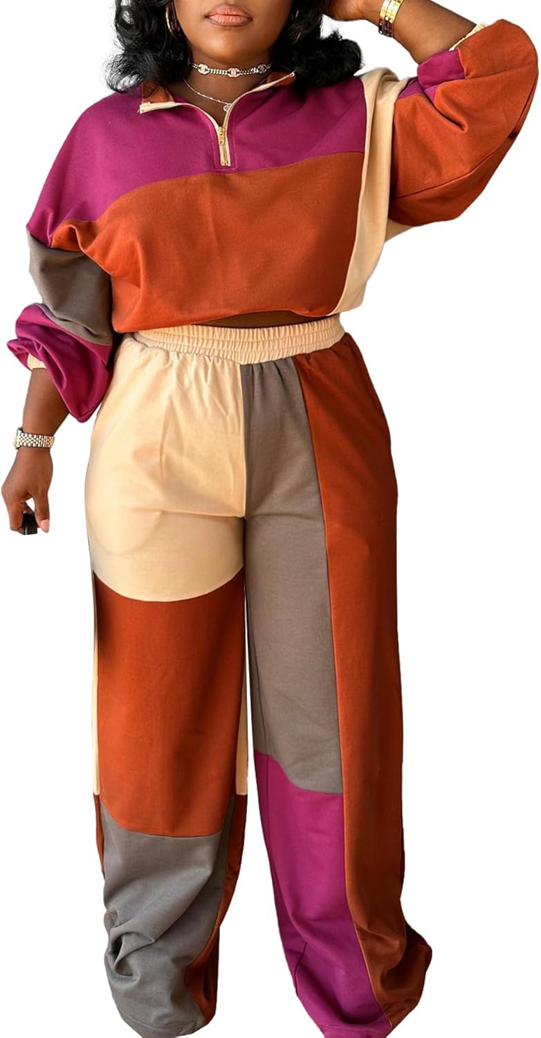 Ptorlio Sweatsuits Women 2 Piece Outfit Casual Long Sleeve Color Block Jogger Wide Leg Sweatpants Set Tracksuit