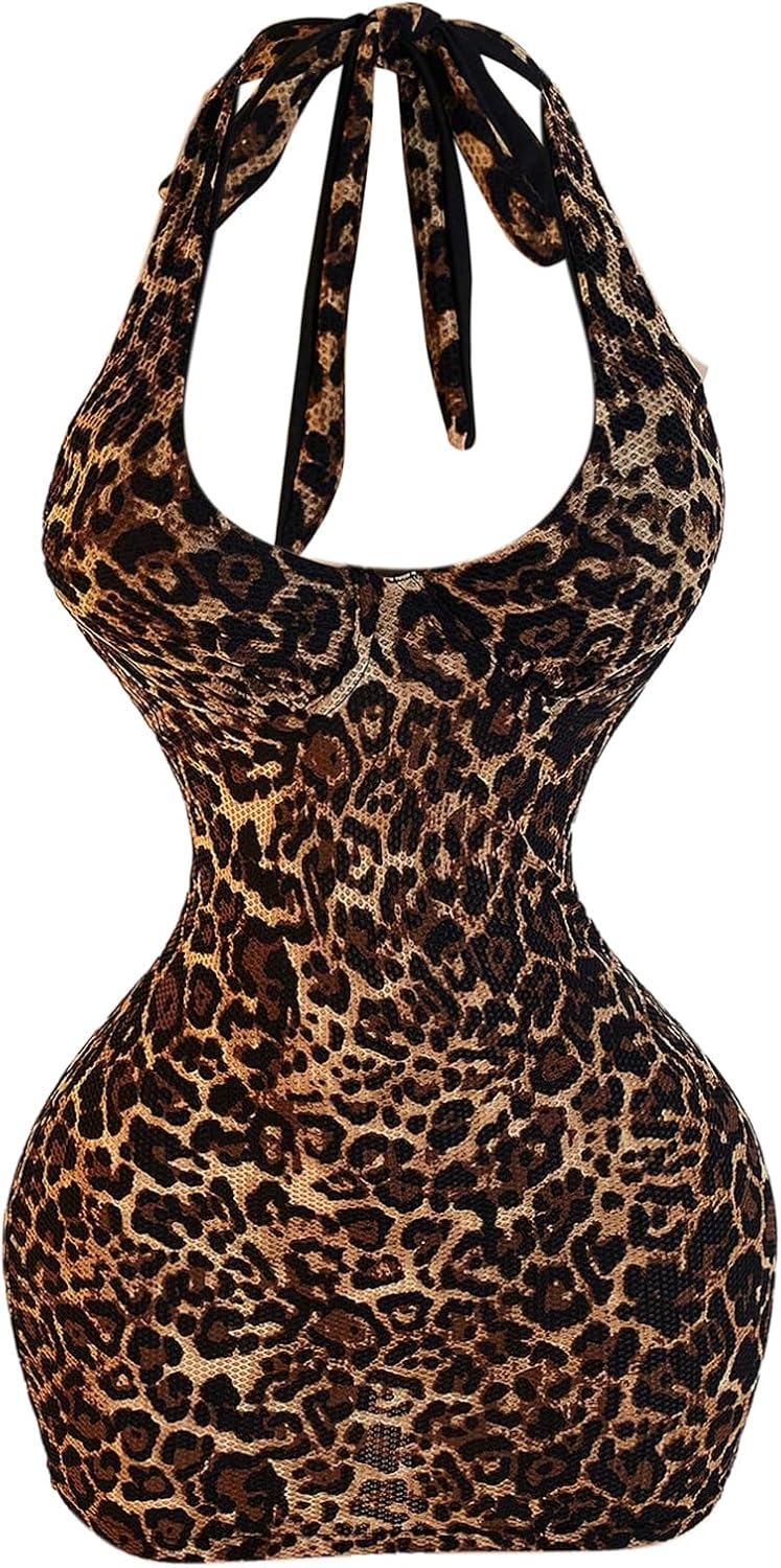 SweatyRocks Women's Leopard Print Halter Dress Backless Bodycon Mini Club Party Cheetah Dresses