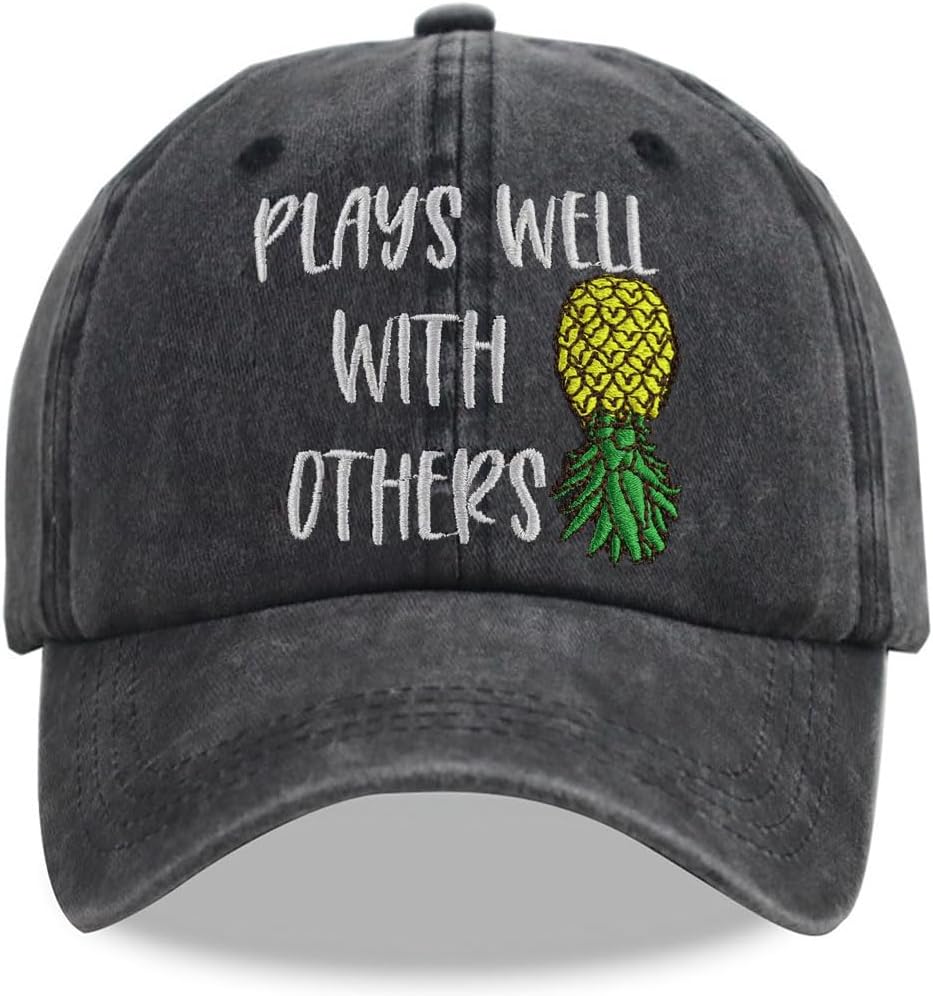 KKMKSHHG Upside Down Pineapple Gifts for Women Men, Funny Plays Well with Others Hat, Birthday Gifts for Dad, Mom, Husband, Wife, Grandpa, Grandma, Adjustable Vintage Cotton Fruit Summer Baseball Cap