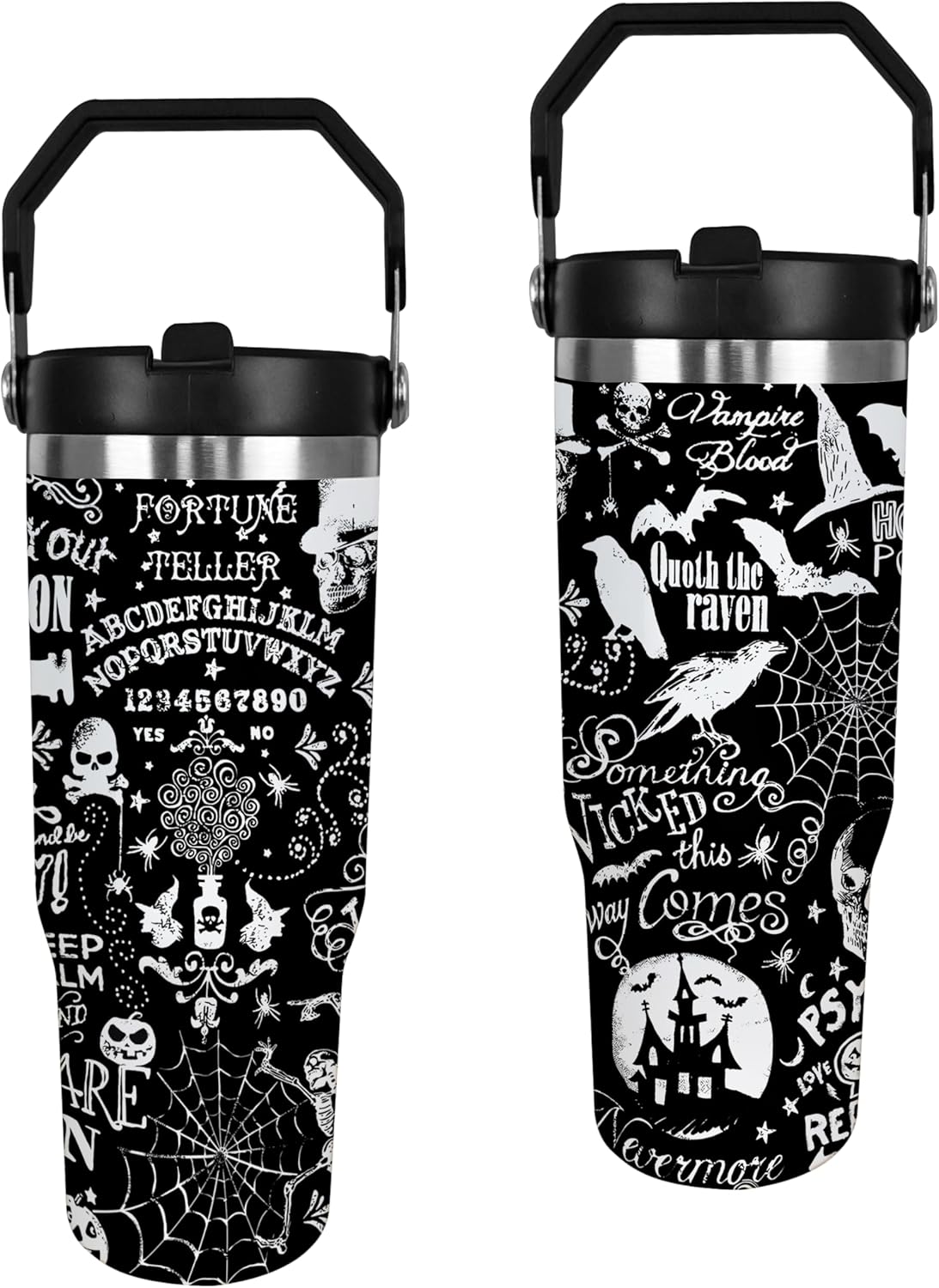 Halloween Tumbler, Spooky Skull Tumbler Spider Bat Cup with Handle and Straw, 30 oz Stainless Steel Insulated Water Bottle Halloween Gifts for Women