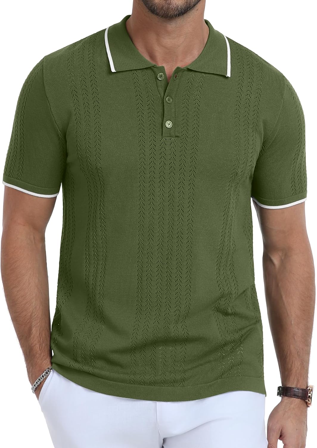 KUYIGO Men's Knit Hollow Out Polo Shirts Short Sleeve Button Collared Shirt Fashion Casual Summer Tops