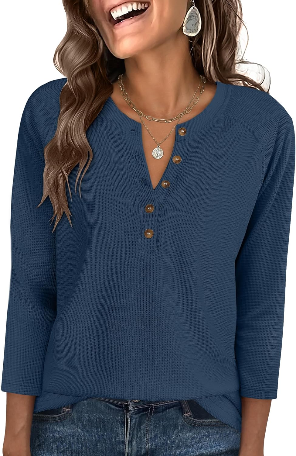 ANRABESS Women's 3/4 Sleeve Waffle Knit Tops V Neck Dressy Casual Button Loose Henley Shirts 2026 Spring Basic Tee Blouse