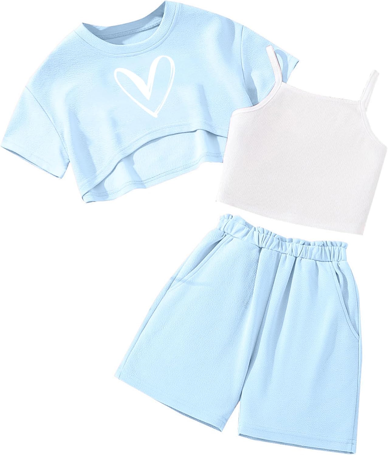 Hilinker Girls 3 Piece Summer Outfits Graphic Crop Tee and Cami Top with Shorts Set
