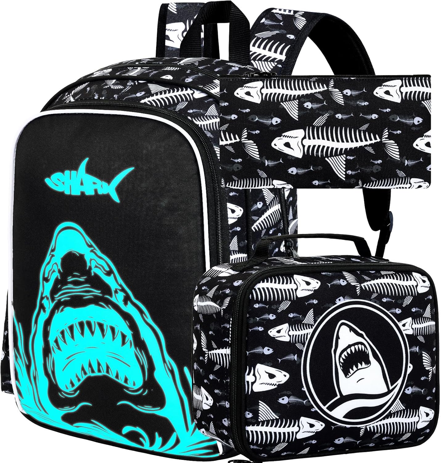 - 3-in-1 Boys School Backpack Set: Exquisite backpack for boys: 17"x"12"x6"+ Lunch bag: 9.5"x8.5"x4"+ Pencil bag, cool shark series set, more choices, offering more convenience and happiness for your boys.