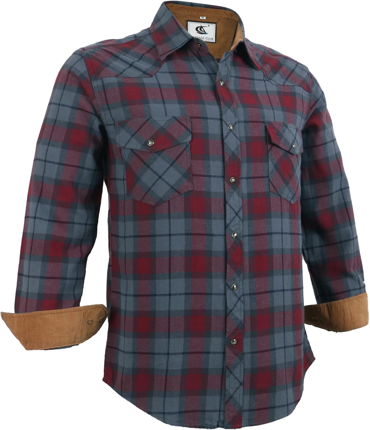 Pearl snap Mens Western Cowboy Flannel Shirts Snap Button Up 100% Cotton Long Sleeve Corduroy Lined Shirt