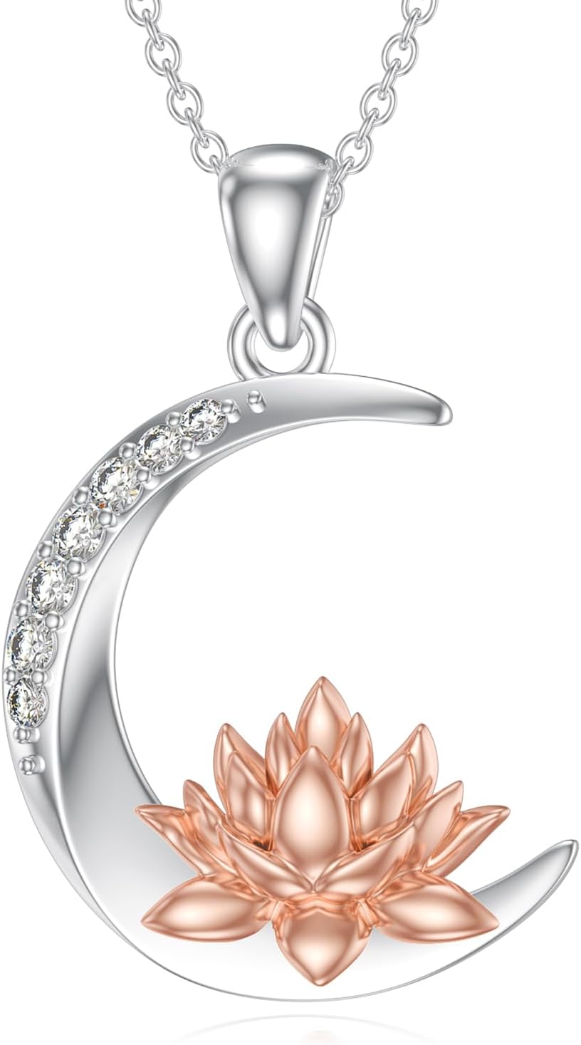 Diamond Moon and Lotus Pendant Necklace for Women 925 Sterling Silver Lab Grown Diamond Jewelry Gifts for Her