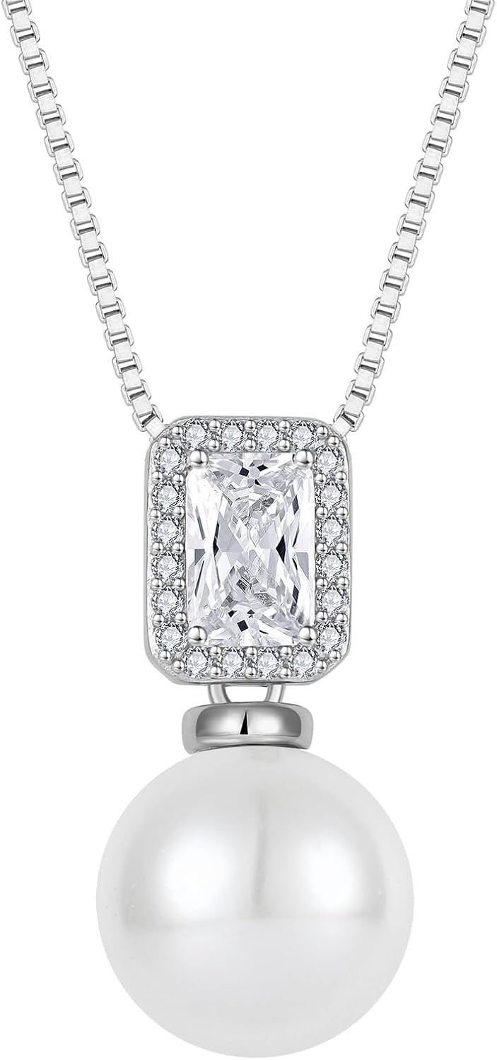 Pearl Necklace for Women 925 Sterling Silver Birthstone Pendant Necklace Emerald Cut Jewelry Gifts for Her